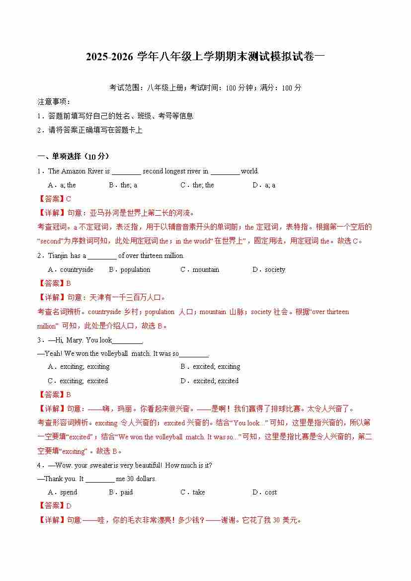 期末必刷卷 -2025-2026学年英语八年级上册 外研版2024 解析卷