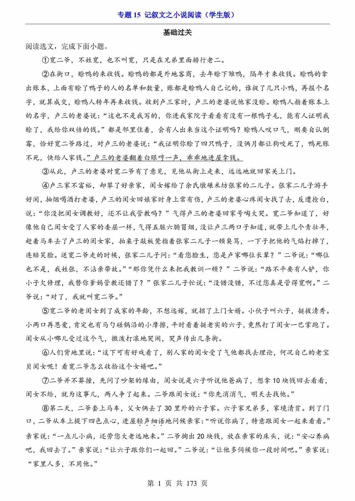 专题15 记叙文之小说阅读PDF