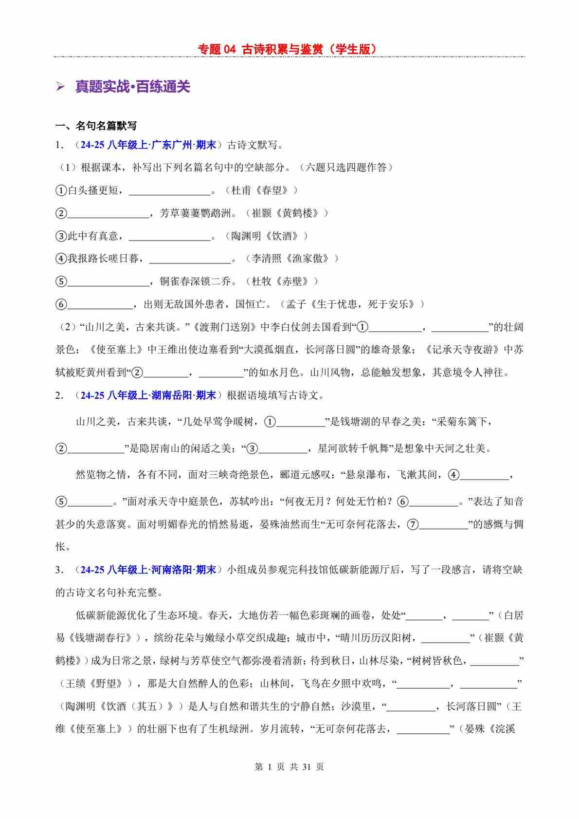 【专项训练】专题04 古诗积累与鉴赏