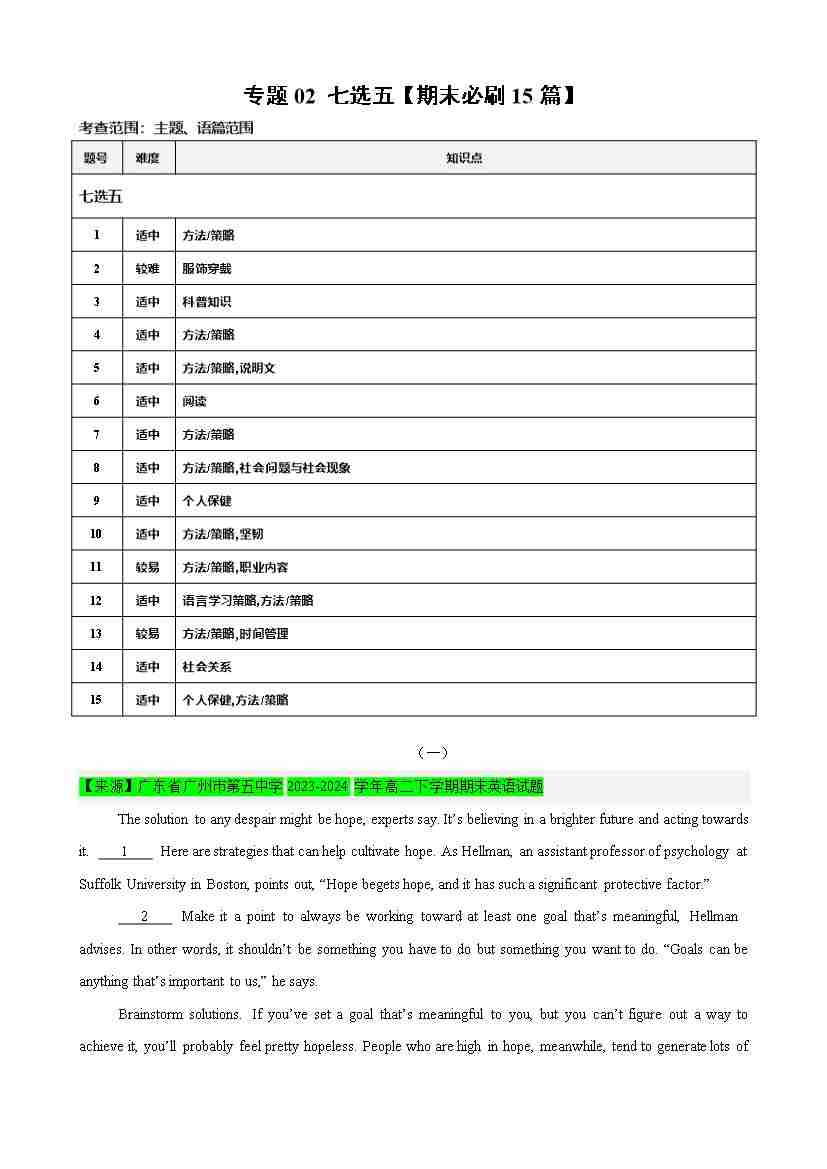 专题02 七选五(期末必刷15篇) - (人教版2019)(教师版)