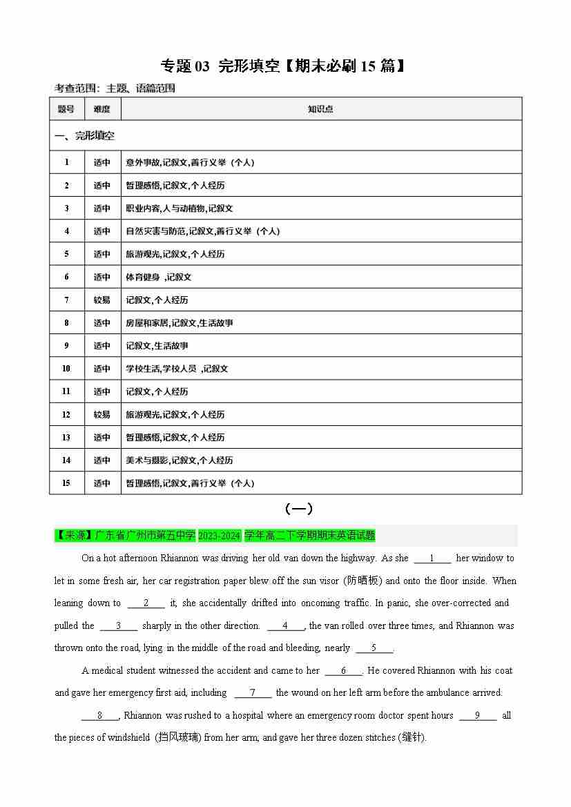 专题03 完形填空(期末必刷15篇) - (人教版2019)(学生版)