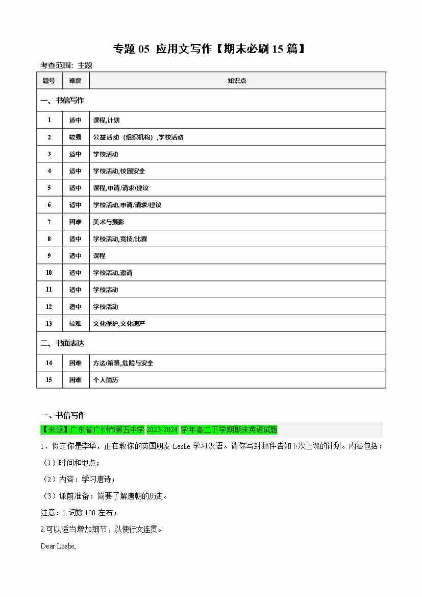 专题05 应用文写作(期末必刷15篇) - (人教版2019)(教师版)