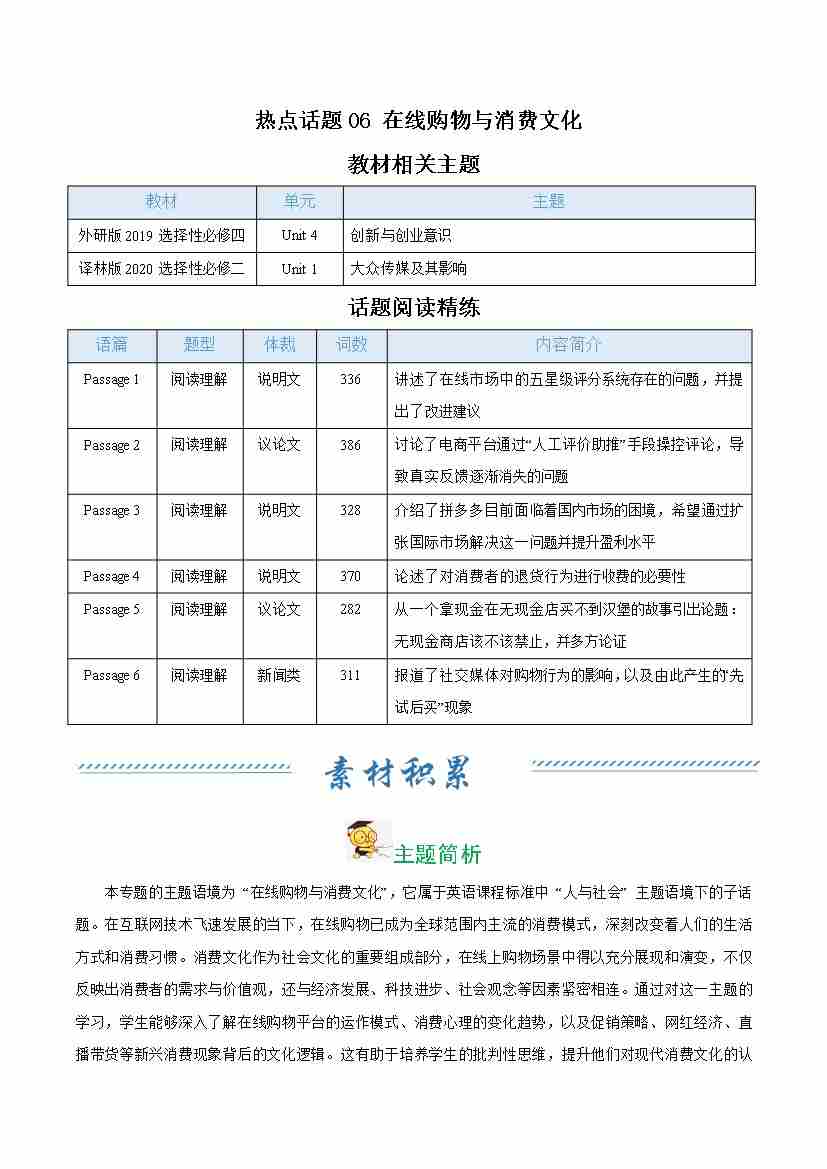 热点话题06 在线购物与消费文化(话题阅读精练)(学生版)