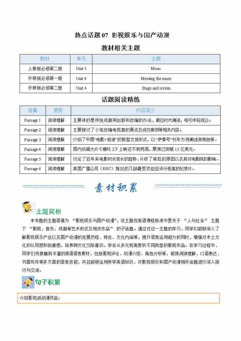 热点话题07 影视娱乐与国产动漫(话题阅读精练)(学生版)