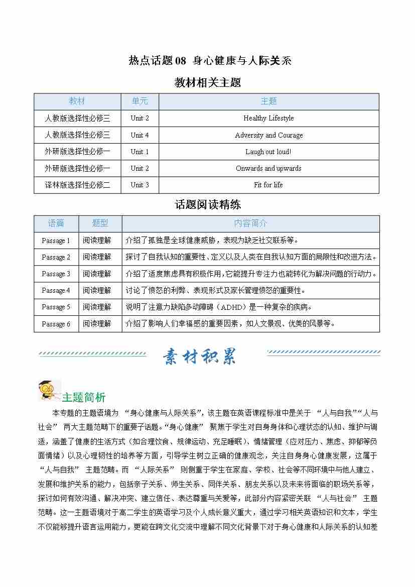 热点话题08 身心健康与人际关系(话题阅读精练)(教师版)