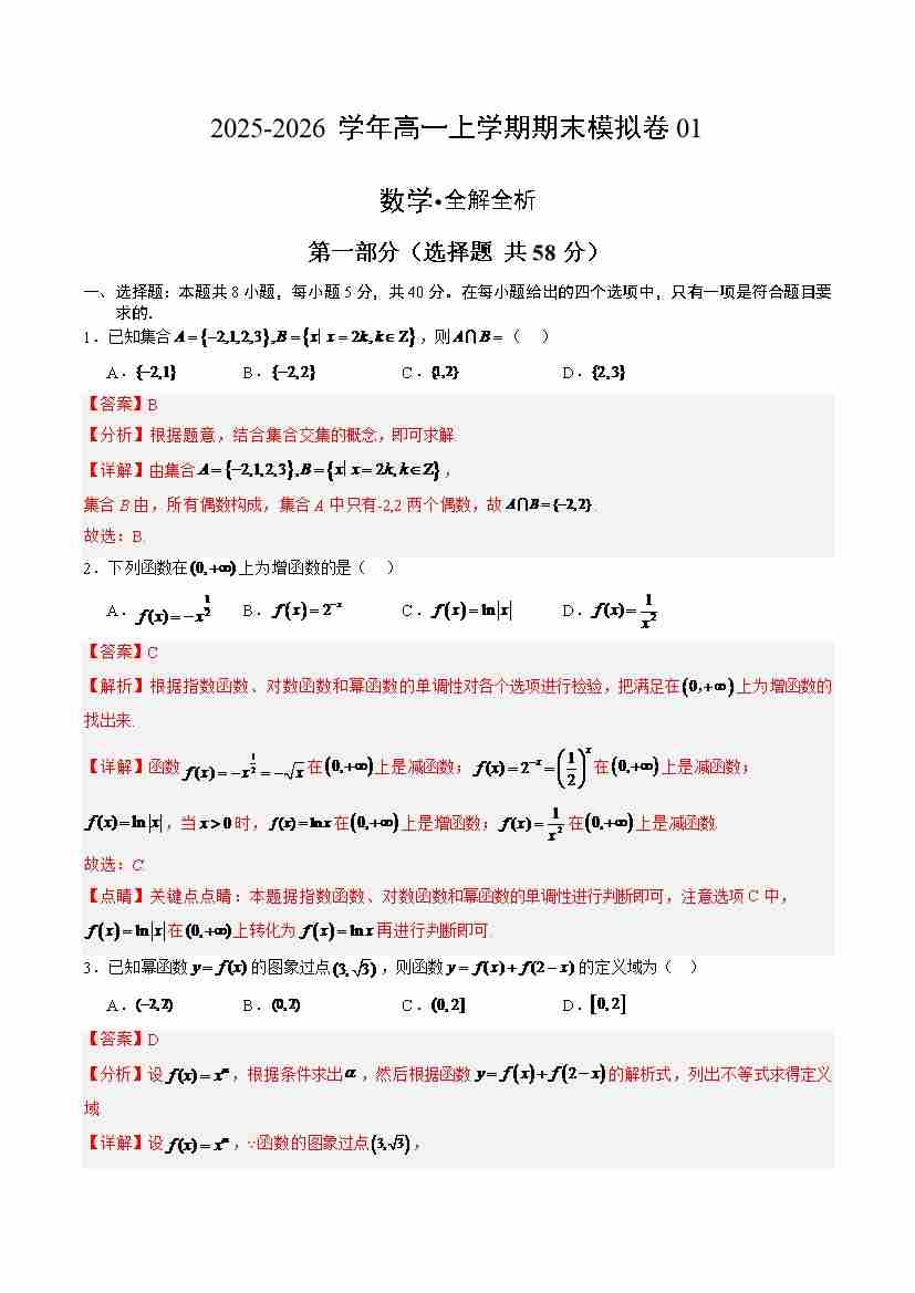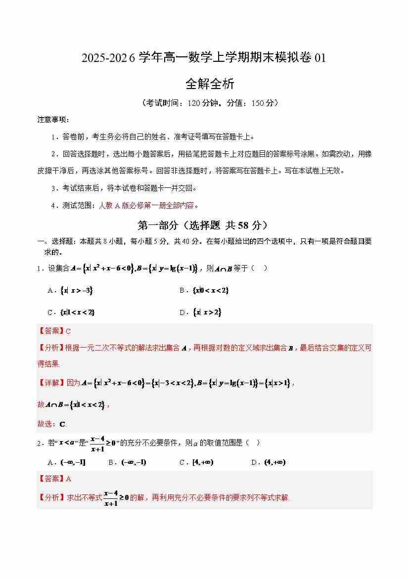 高一数学上学期期末模拟卷01(人教A版)(全解全析)