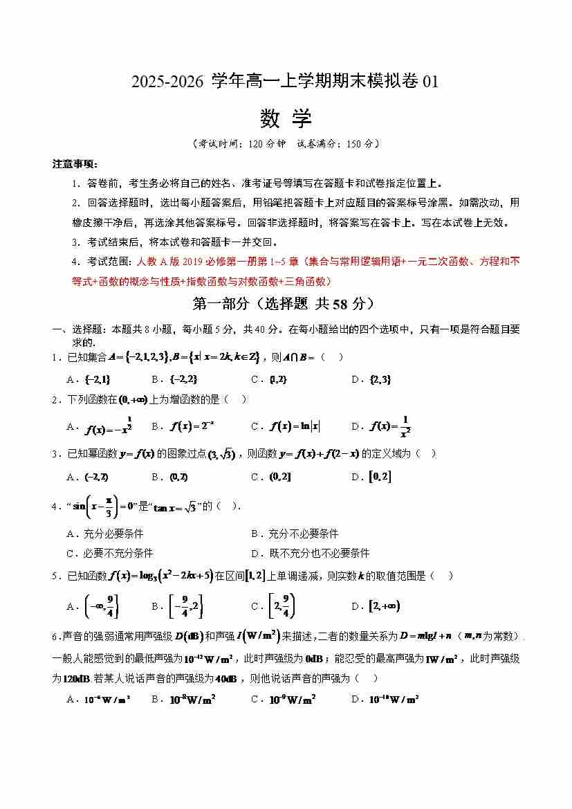 高一数学期末模拟卷01(测试范围:人教A版必修第一册全部内容)(考试版A4)