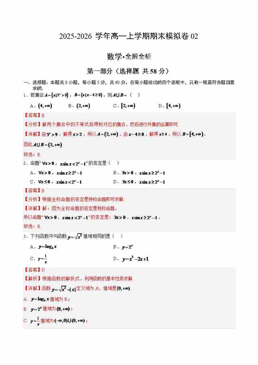 高一数学上学期期末考前必刷押题卷02(范围:必修一全册 提高卷)(教师版)