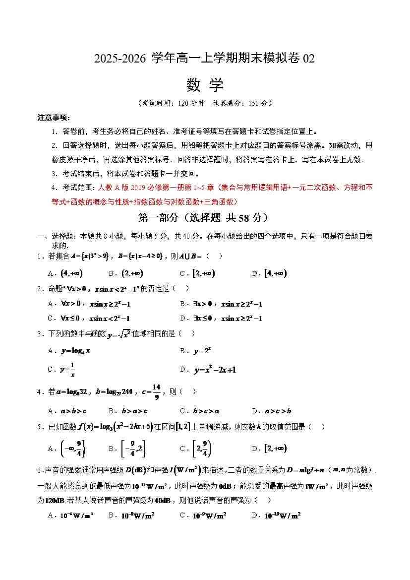 高一数学上学期期末模拟卷02(人教A版)(考试版A4)
