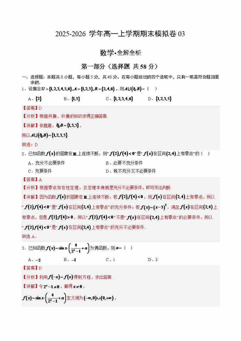 高一数学上学期期末模拟卷03(人教A版)(全解全析)