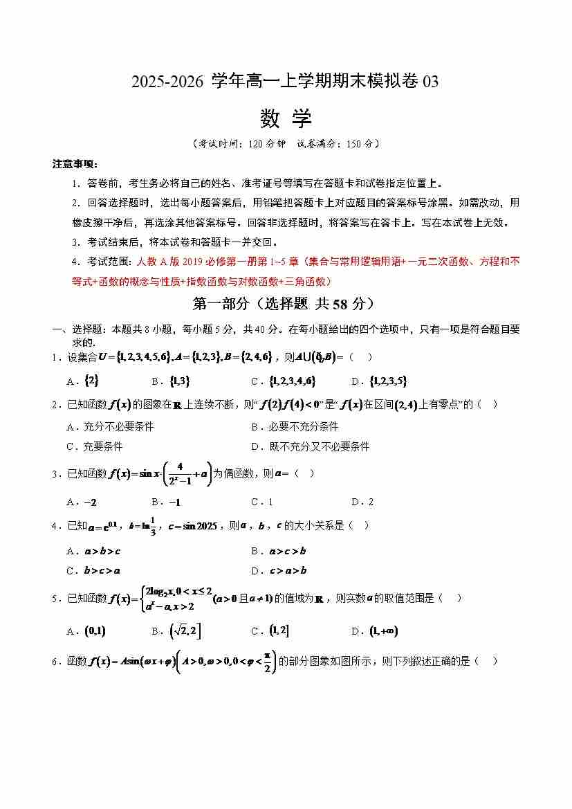 高一数学上学期期末模拟卷03(人教A版)(考试版A4)