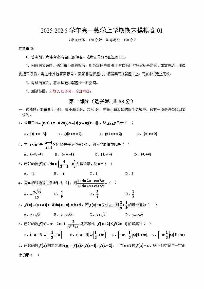 高一数学上学期期末模拟卷01(人教A版)(考试版A4)