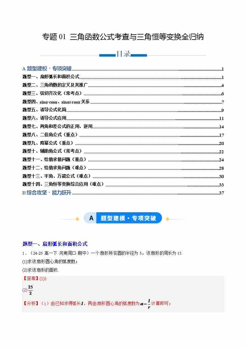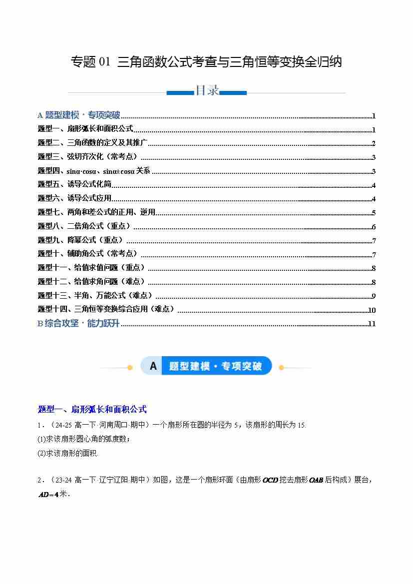 专题01 三角函数公式考查与三角恒等变换全归纳(专项训练14大重点题型)(原卷版)