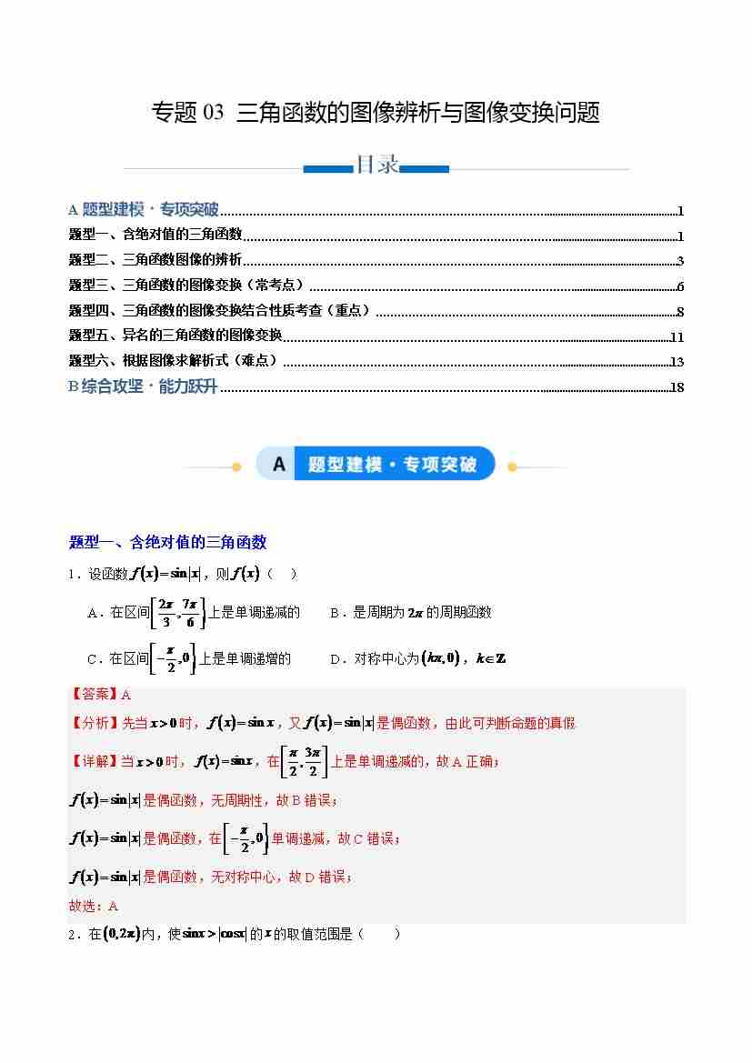 专题03 三角函数的图像辨析与图像变换问题(专项训练6大重点题型)(解析版)