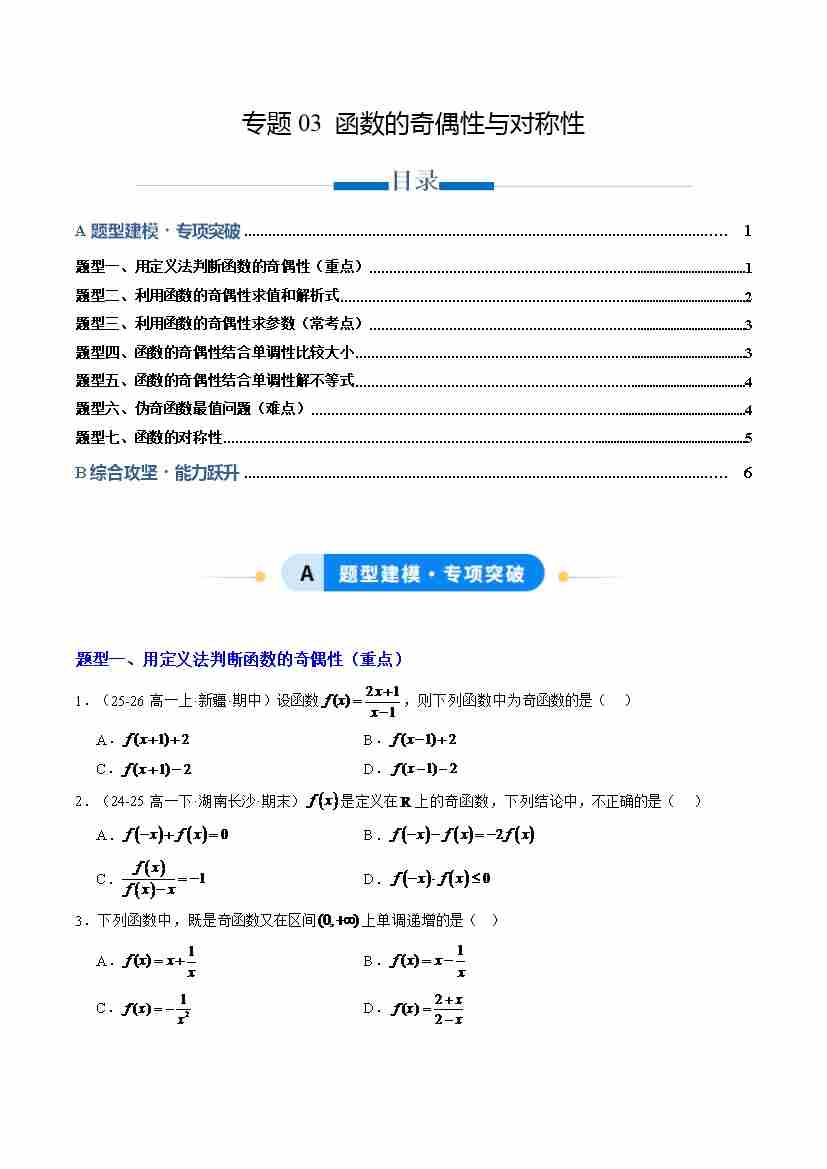 专题03 函数的奇偶性与对称性(专项训练7大重点题型)(学生版)