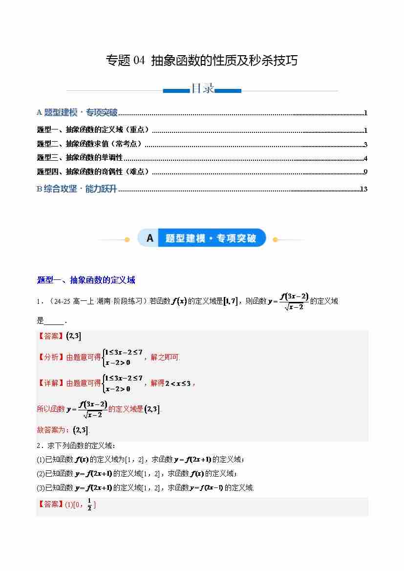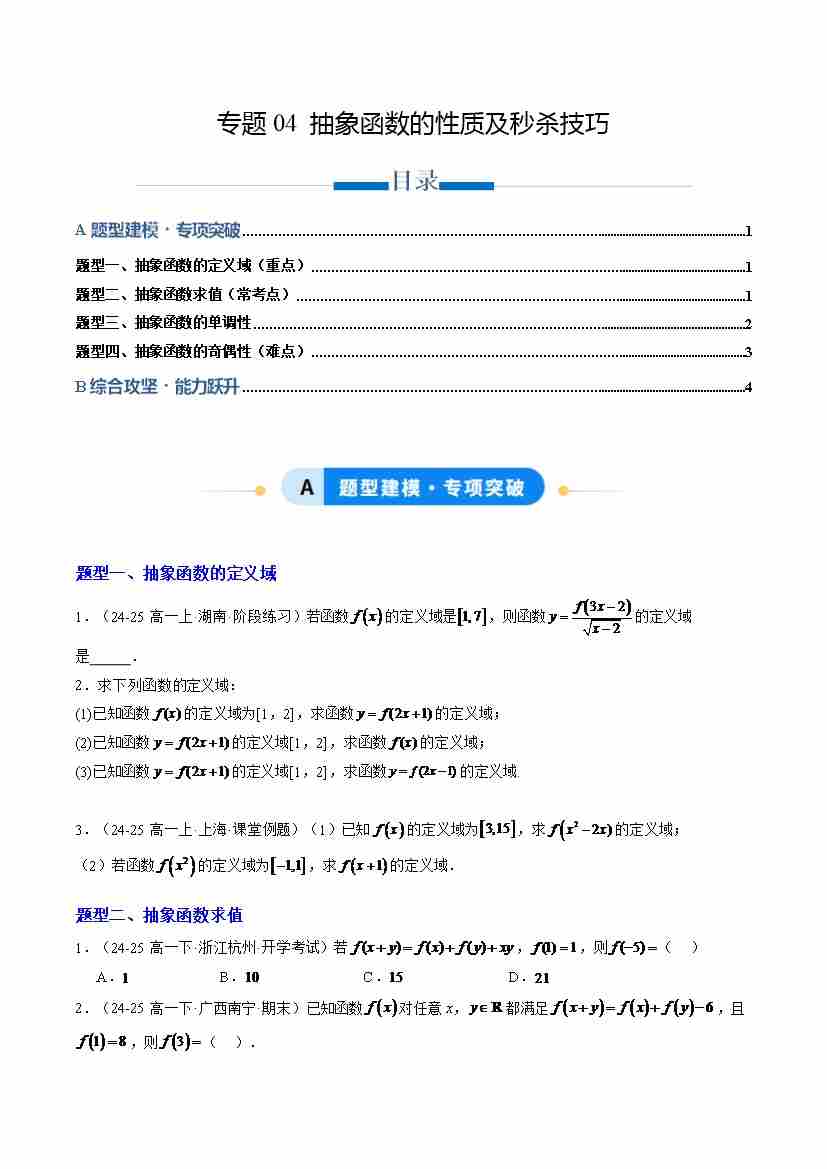 专题04 抽象函数的性质及秒杀技巧(专项训练4大重点题型)(学生版)