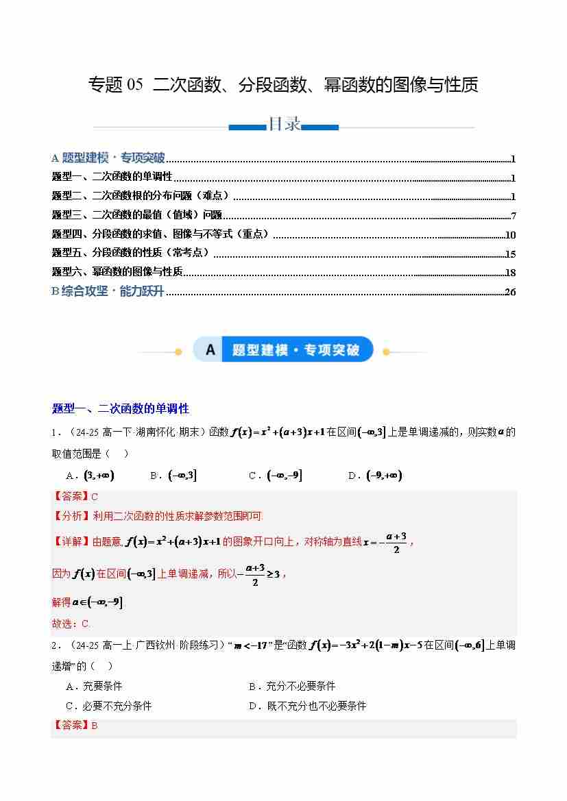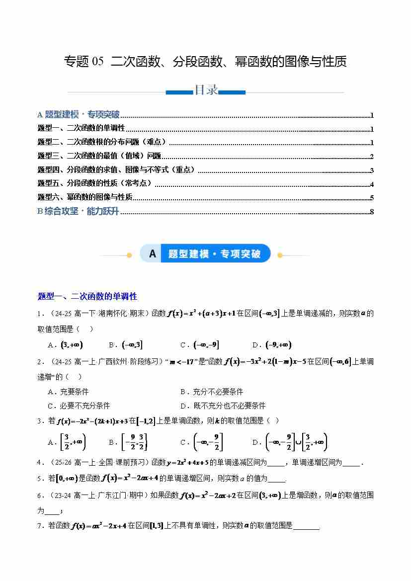 专题05 二次函数、分段函数、幂函数的图像与性质(专项训练6大重点题型)(学生版)