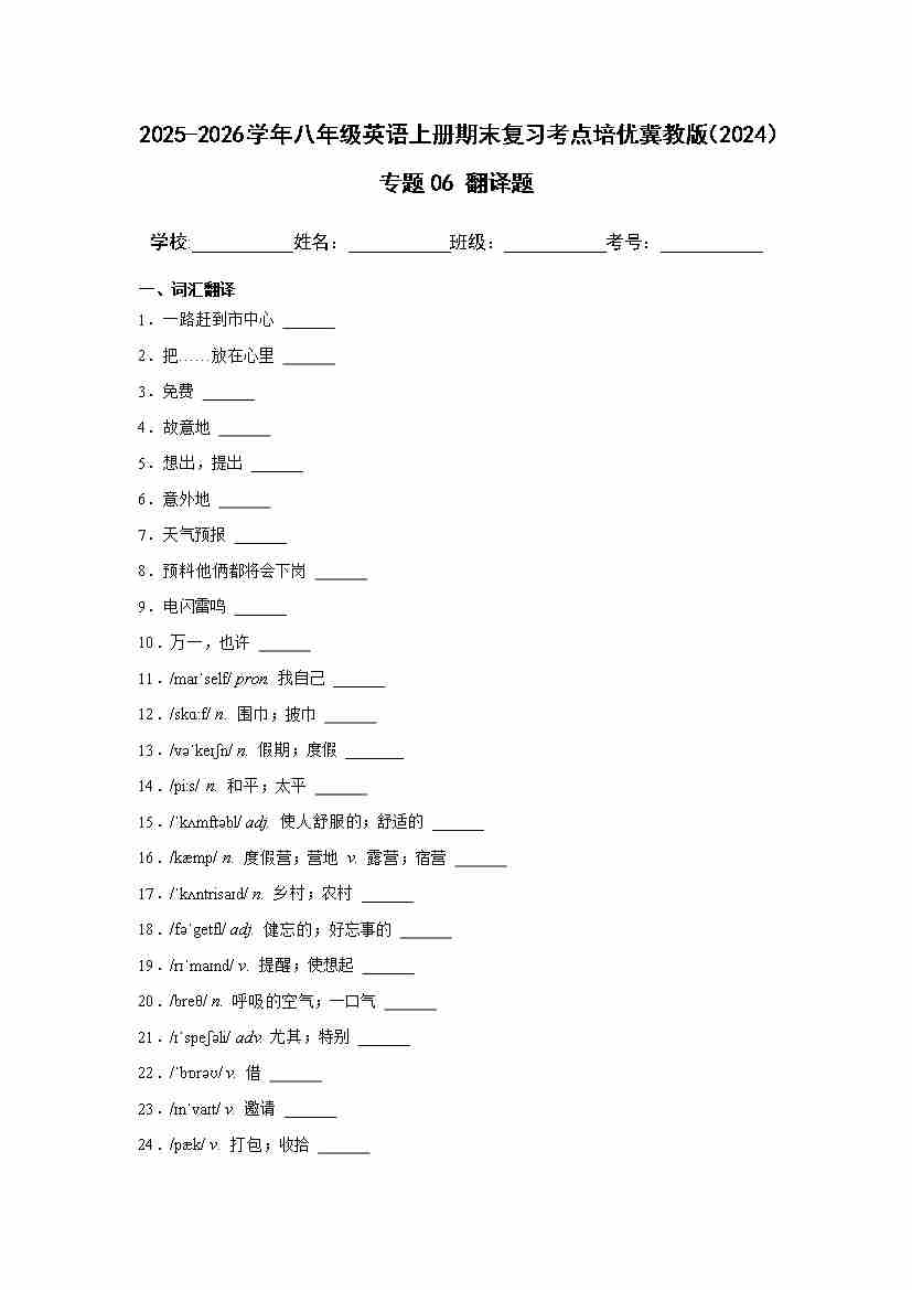 25秋八上冀教 专题05 根据汉语提示补全句子