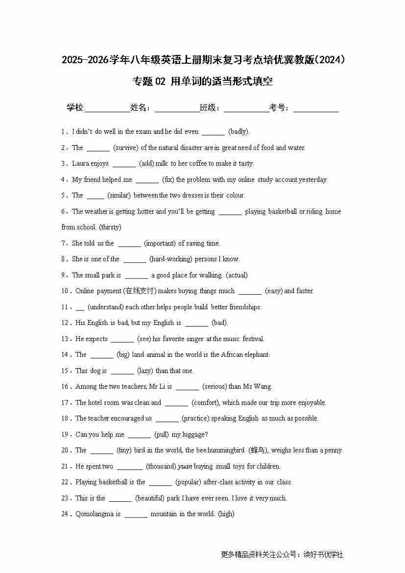 25秋八上冀教 专题02 用单词的适当形式填空