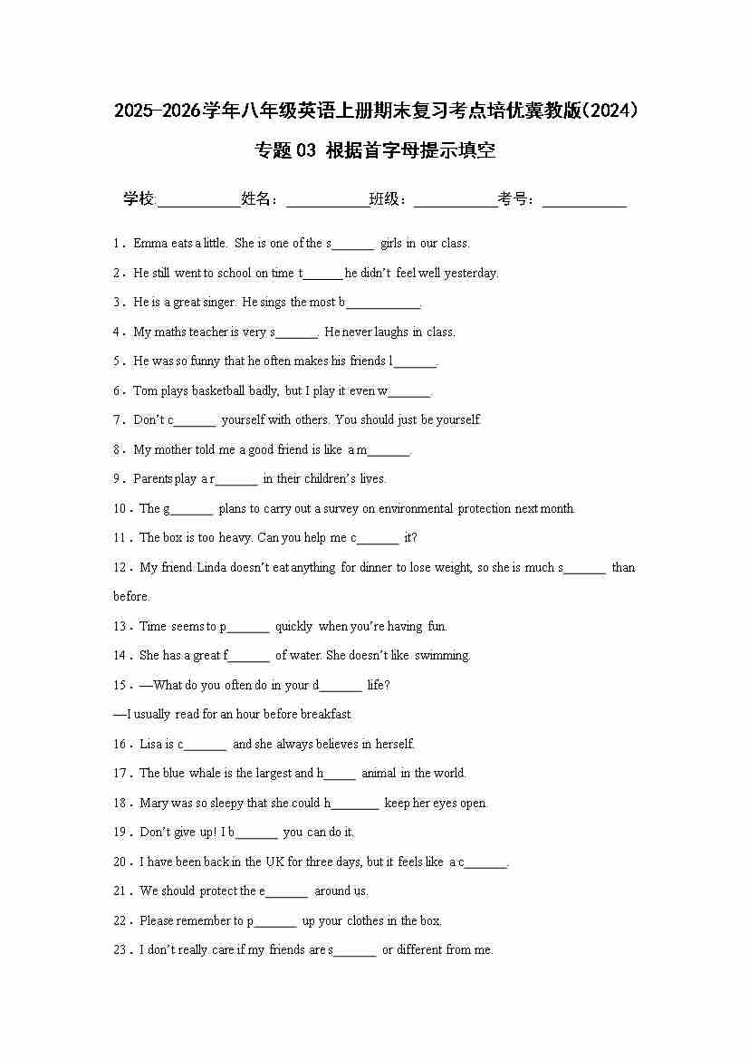 25秋八上冀教 专题03 根据首字母提示填空