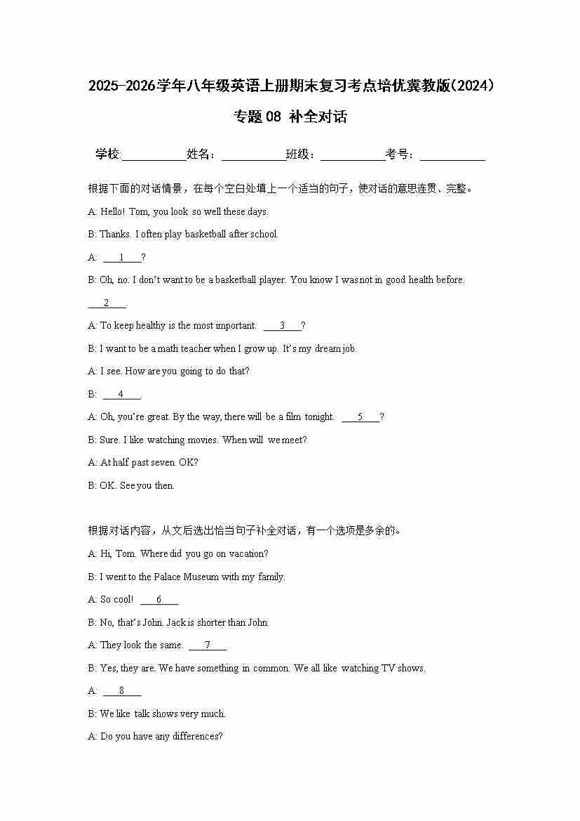 25秋八上冀教 专题08 补全对话