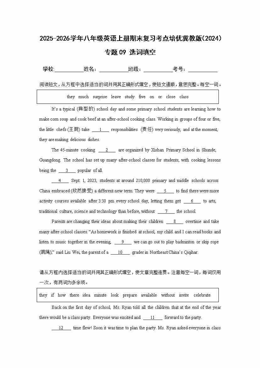 25秋八上冀教 专题11 完形填空