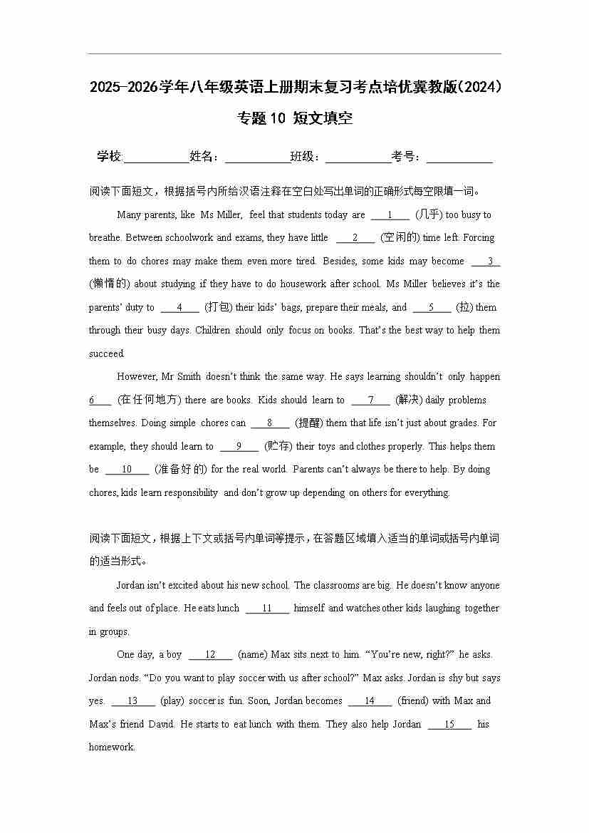 25秋八上冀教 专题10 短文填空