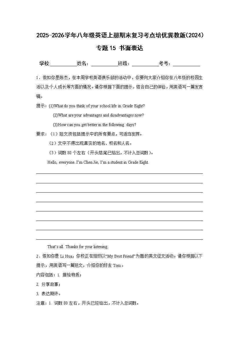25秋八上冀教 专题15 书面表达