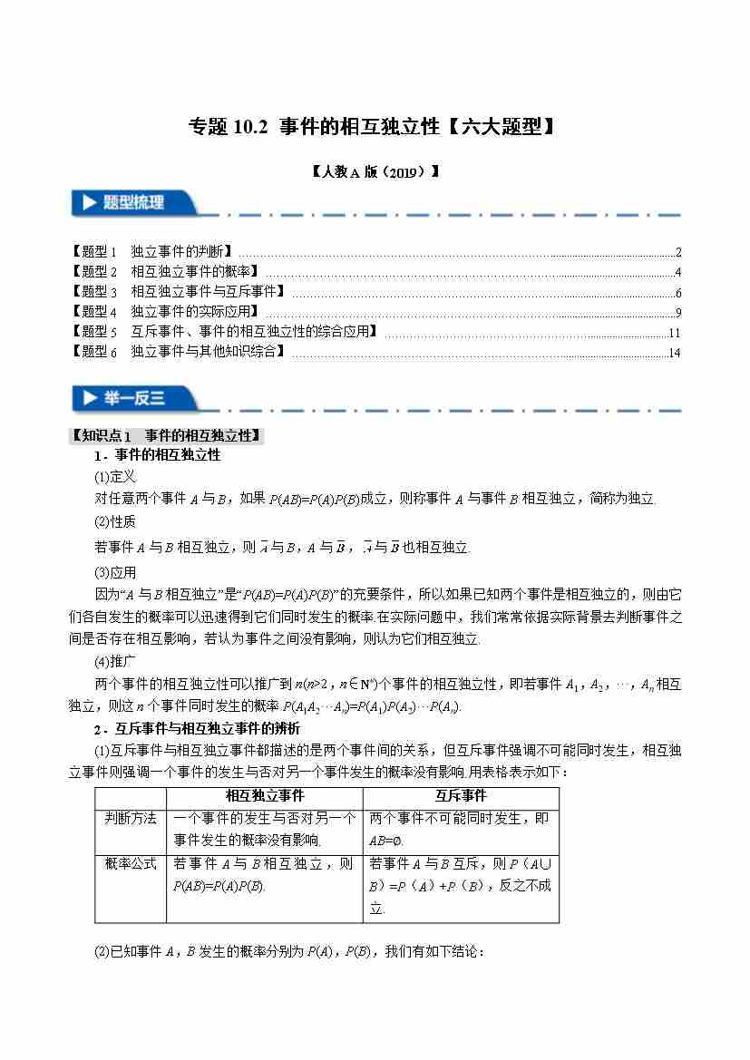 专题10.2 事件的相互独立性(六大题型)(举一反三)(人教A版2019必修第二册)(学生版)