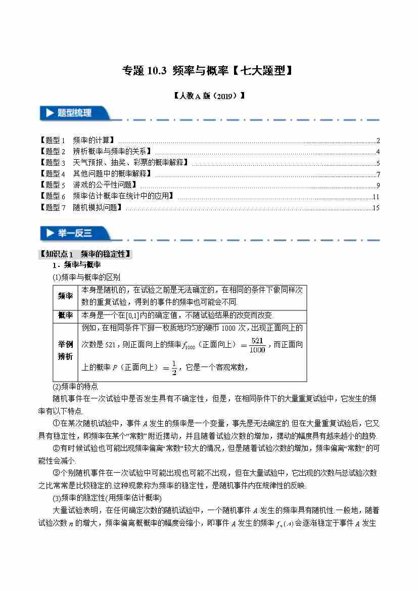 专题10.3 频率与概率(七大题型)(举一反三)(人教A版2019必修第二册)(学生版)
