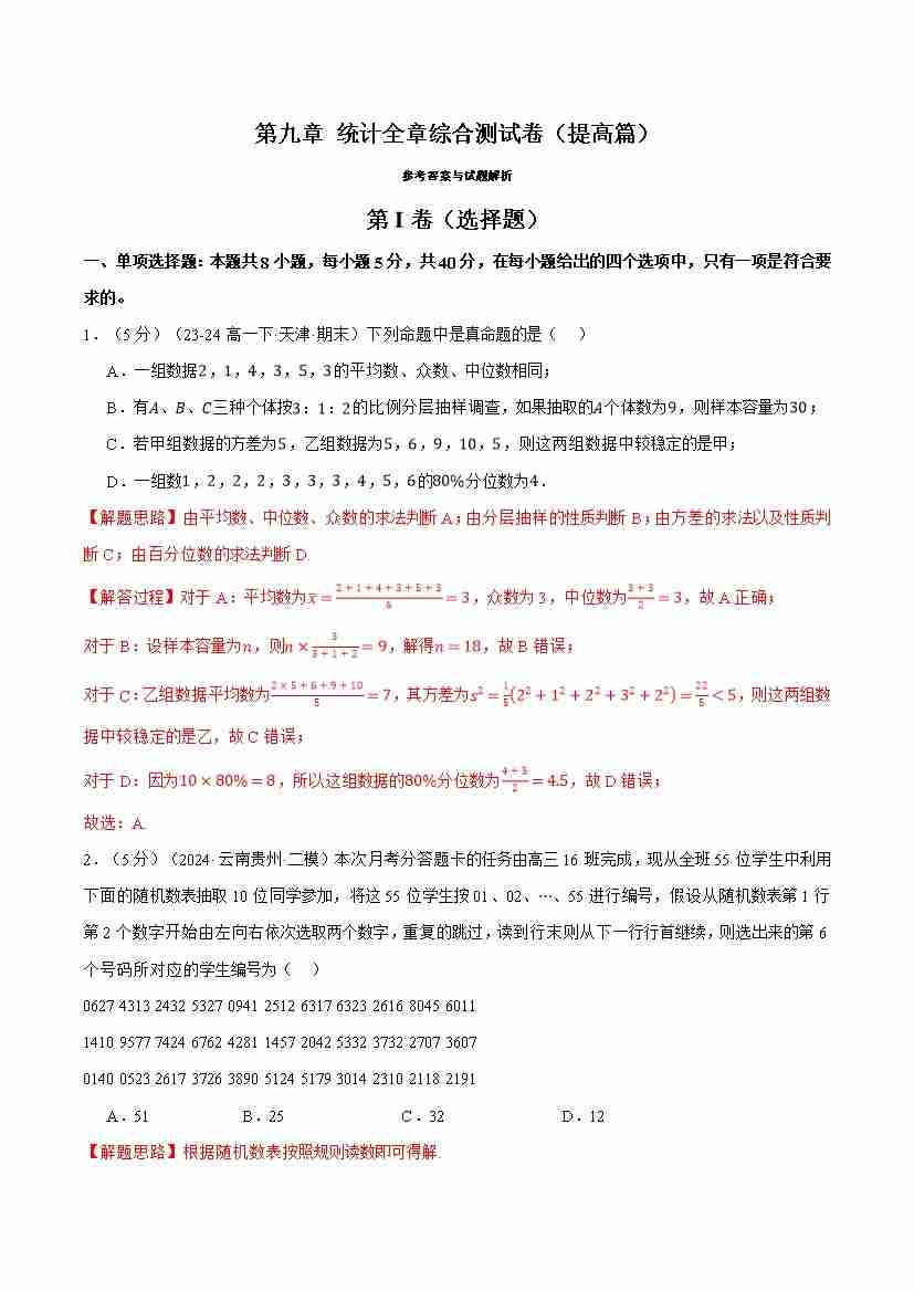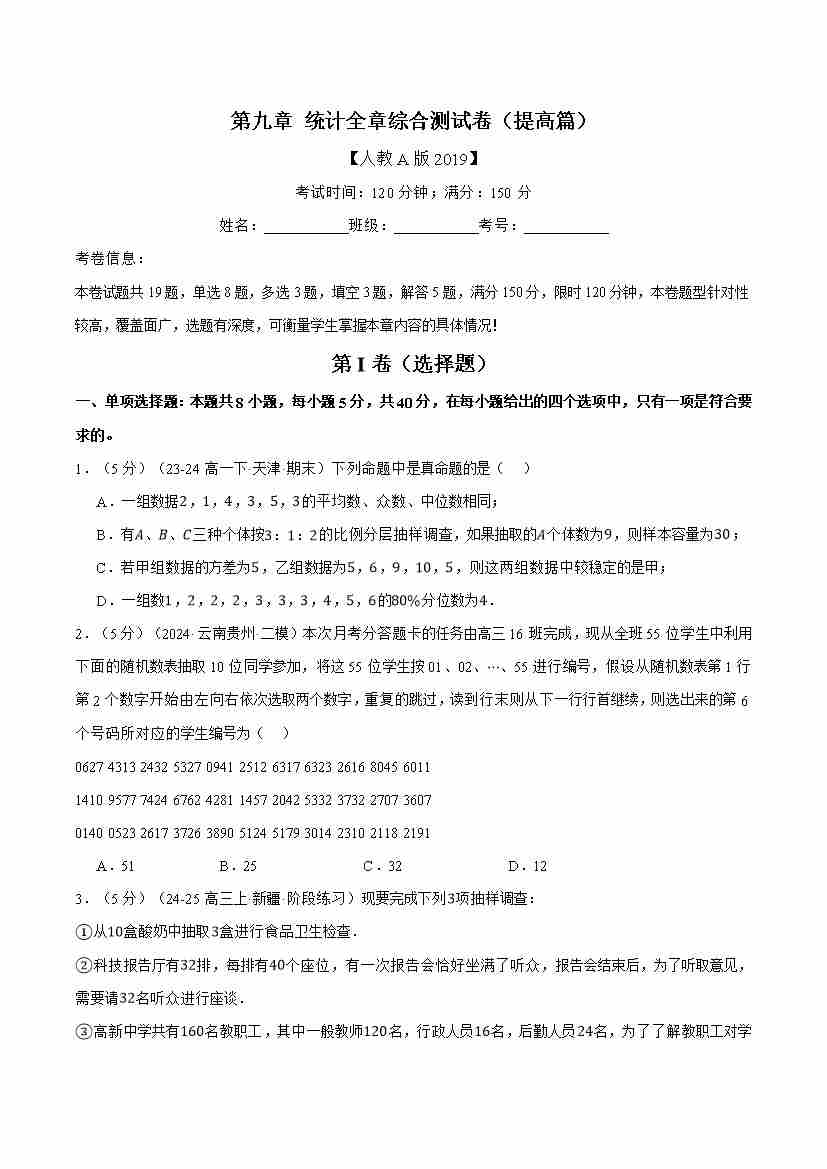 专题9.10 统计全章综合测试卷(提高篇)(人教A版2019必修第二册)(学生版)