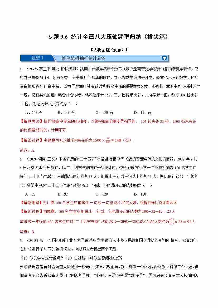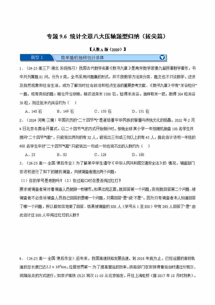 专题9.6 统计全章八大压轴题型归纳(拔尖篇)(举一反三)(人教A版2019必修第二册)(学生版)