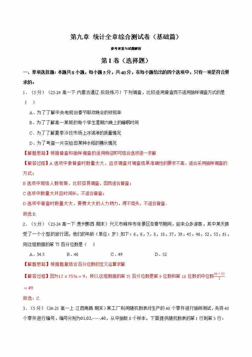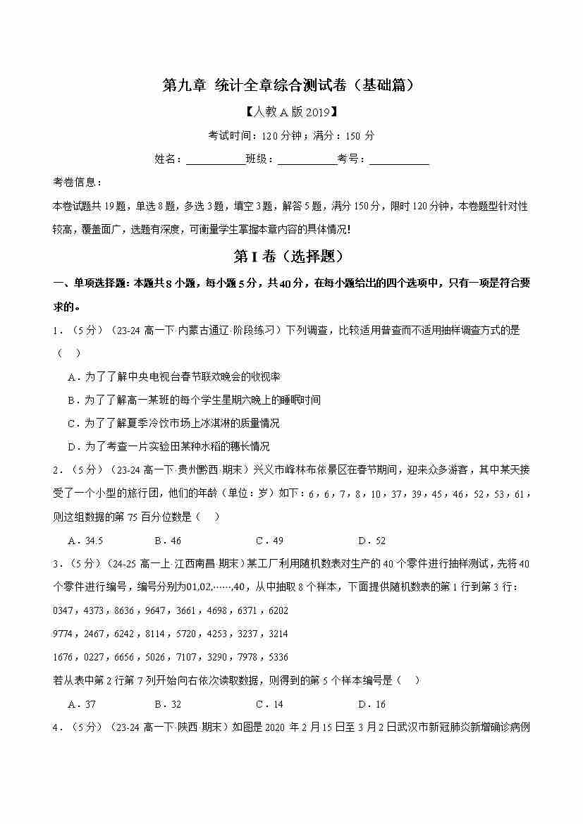 专题9.9 统计全章综合测试卷(基础篇)(人教A版2019必修第二册)(学生版)
