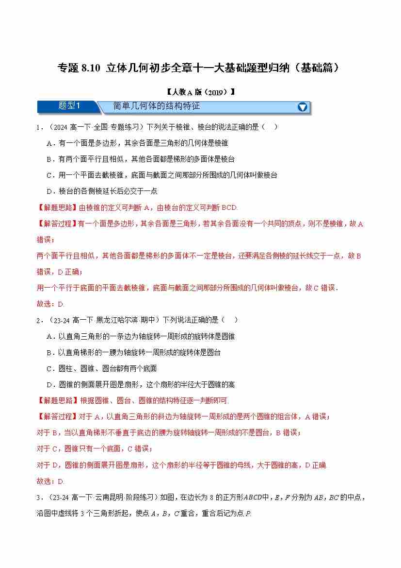 专题8.10 立体几何初步全章十一大基础题型归纳(基础篇)(举一反三)(人教A版2019必修第二册)(教师版)