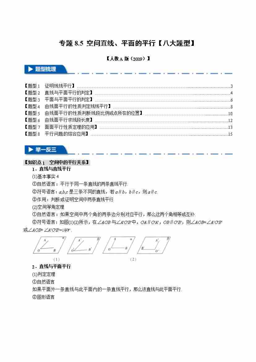 专题8.5 空间直线、平面的平行(八大题型)(举一反三)(人教A版2019必修第二册)(学生版)