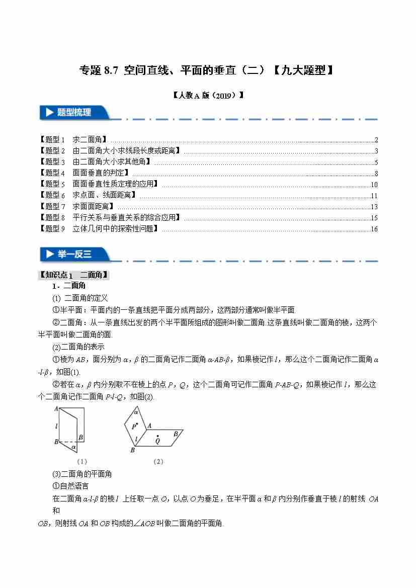 专题8.7 空间直线、平面的垂直(二)(九大题型)(举一反三)(人教A版2019必修第二册)(学生版)