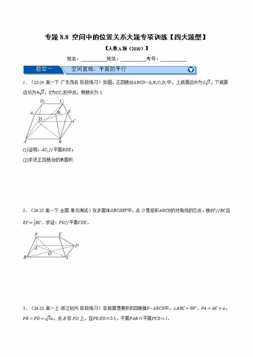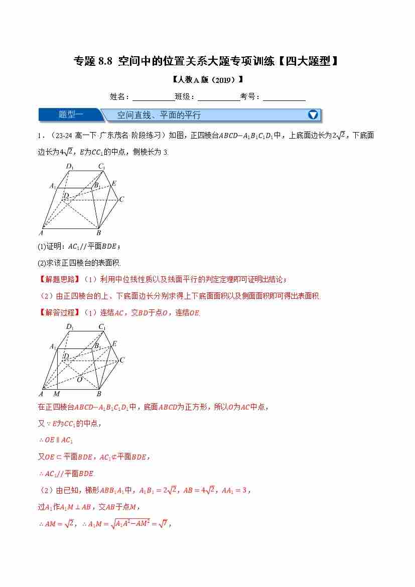 专题8.8 空间中的位置关系大题专项训练(四大题型)(举一反三)(人教A版2019必修第二册)(学生版)