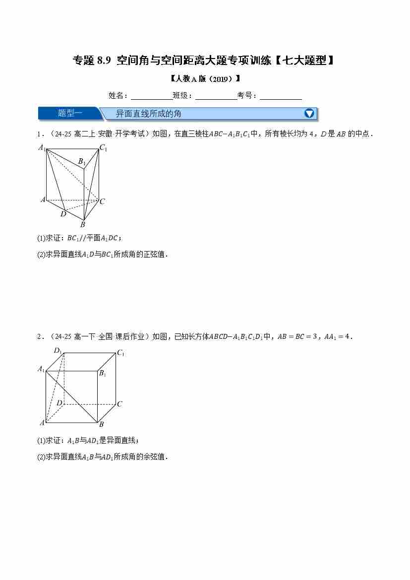 专题8.9 空间角与空间距离大题专项训练(七大题型)(举一反三)(人教A版2019必修第二册)(学生版)
