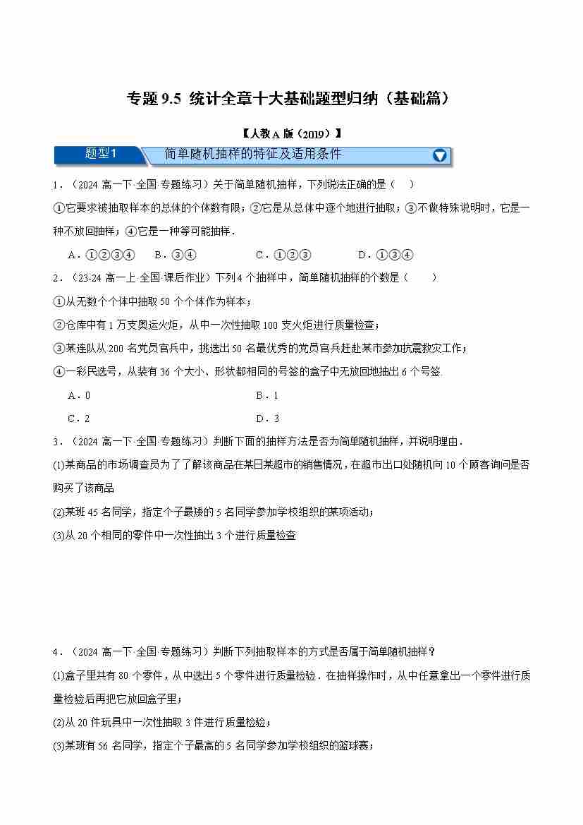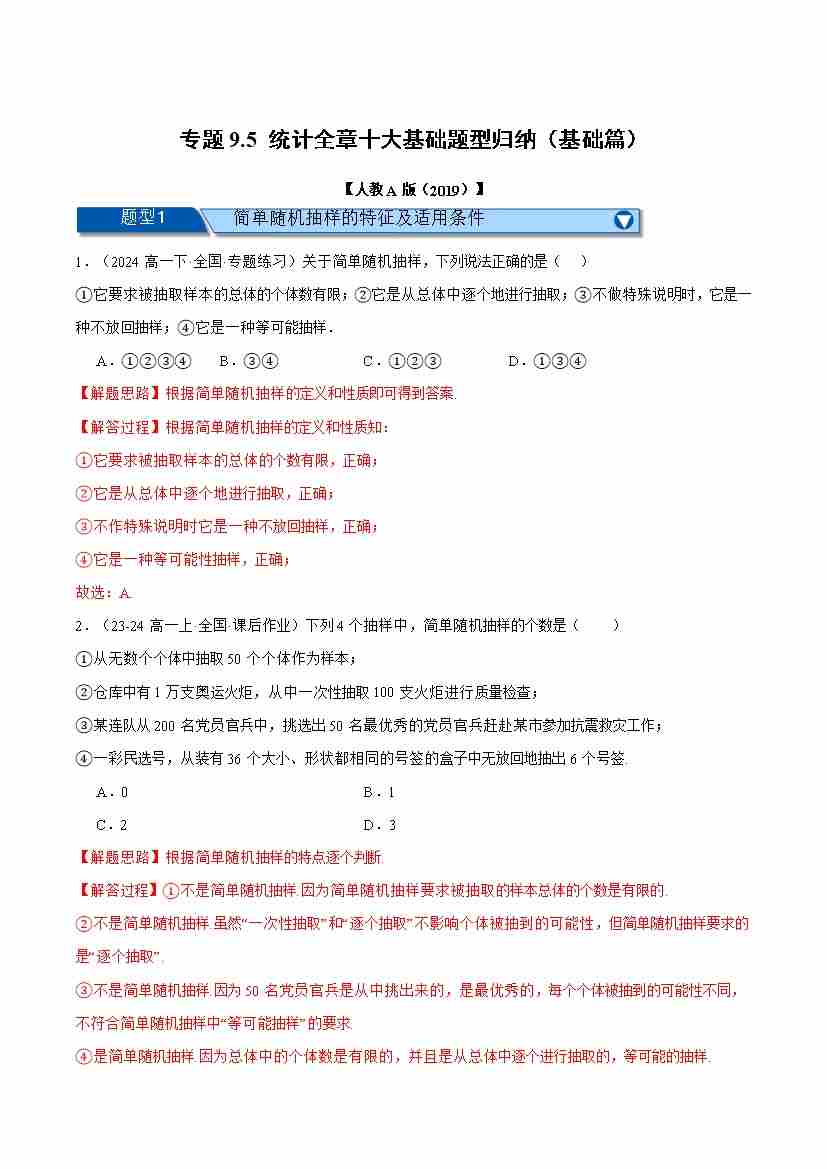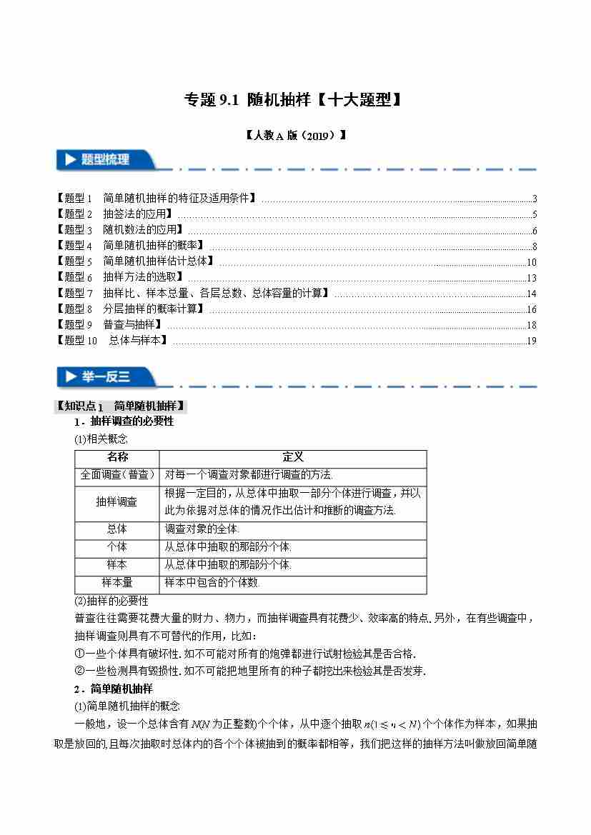 专题9.1 随机抽样(十大题型)(举一反三)(人教A版2019必修第二册)(教师版)