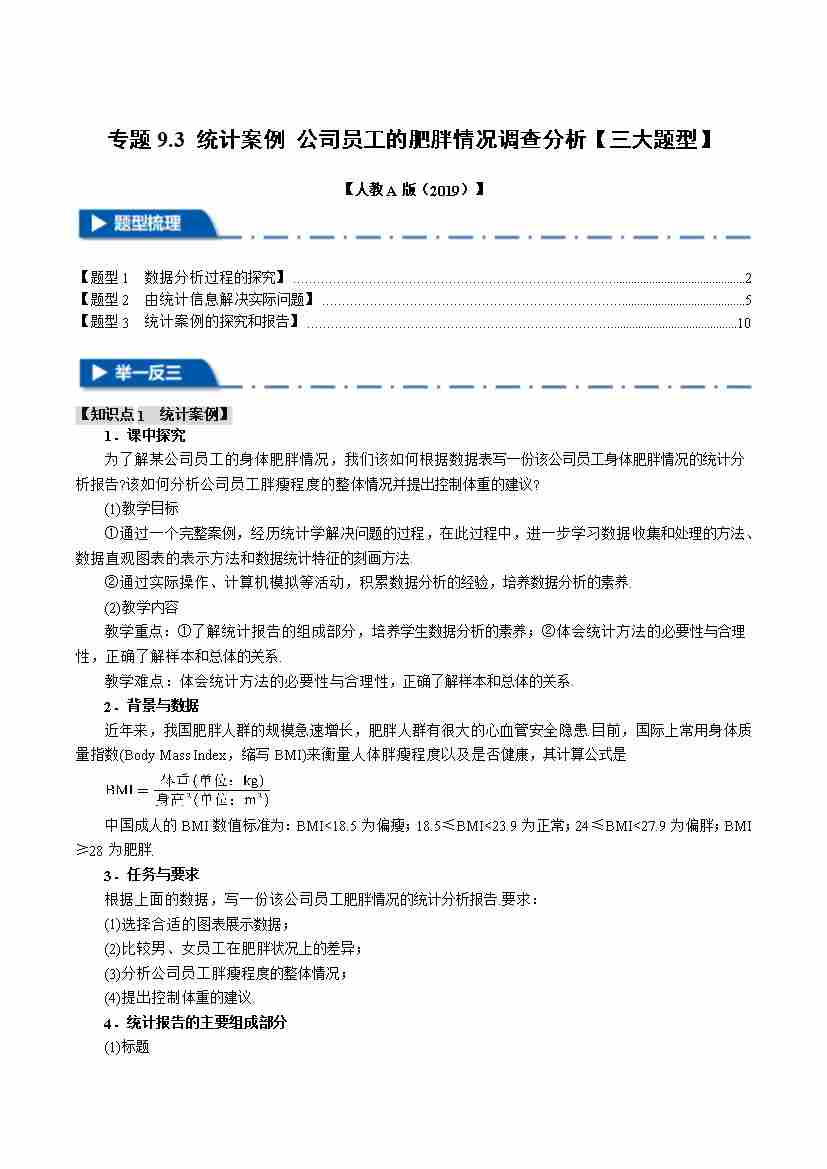 专题9.3 统计案例 公司员工的肥胖情况调查分析(三大题型)(举一反三)(人教A版2019必修第二册)(学生版)