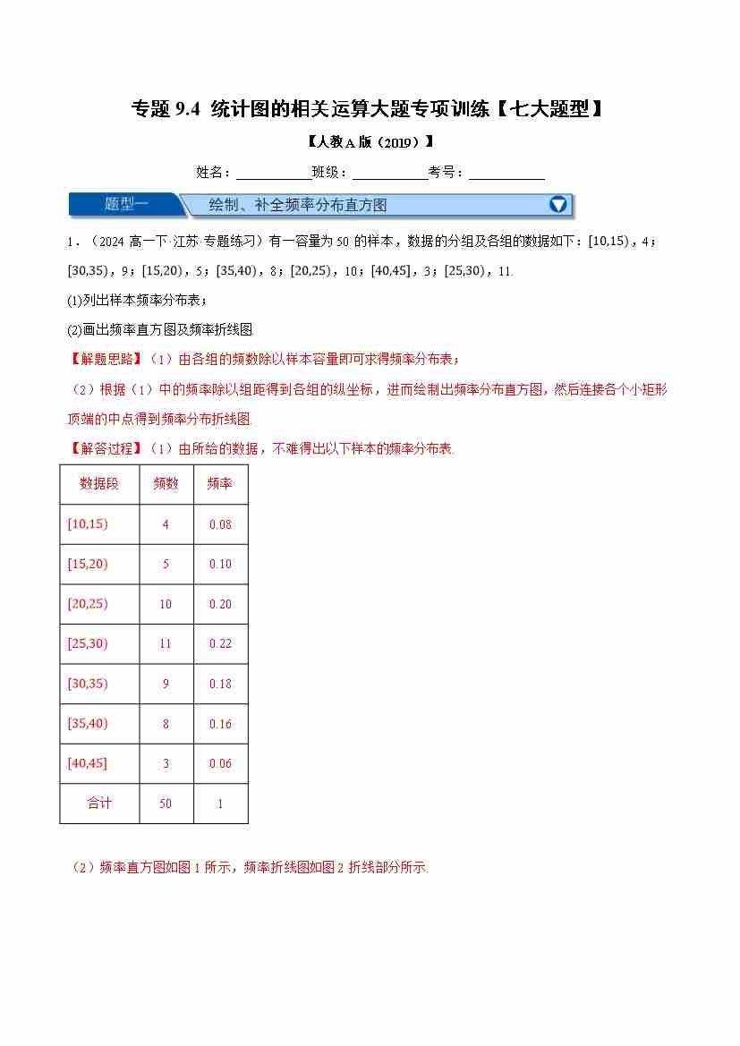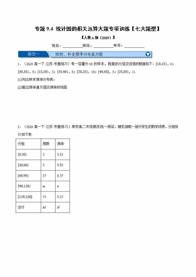 专题9.4 统计图的相关运算大题专项训练(七大题型)(举一反三)(人教A版2019必修第二册)(学生版)