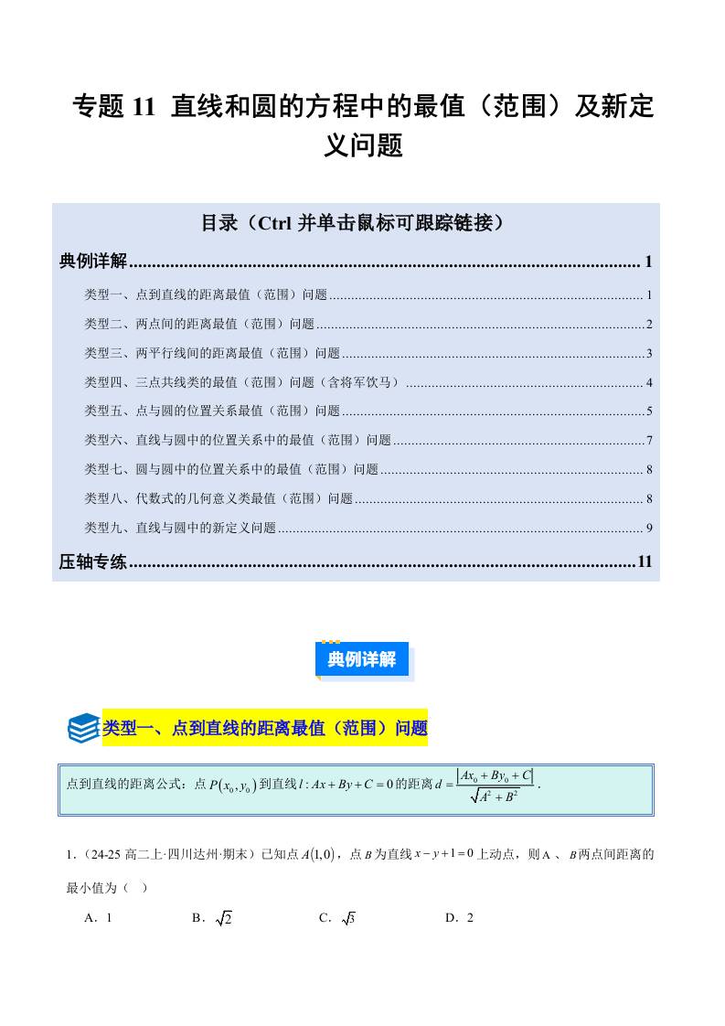 专题11 直线和圆的方程中的最值(范围)及新定义问题(压轴题9大类型专项训练)(学生版)