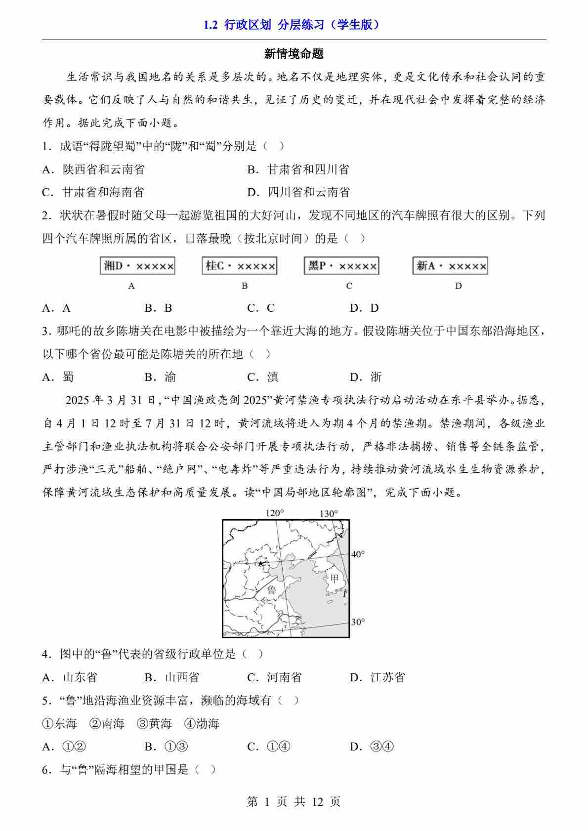 1.2 行政区划(分层练习)
