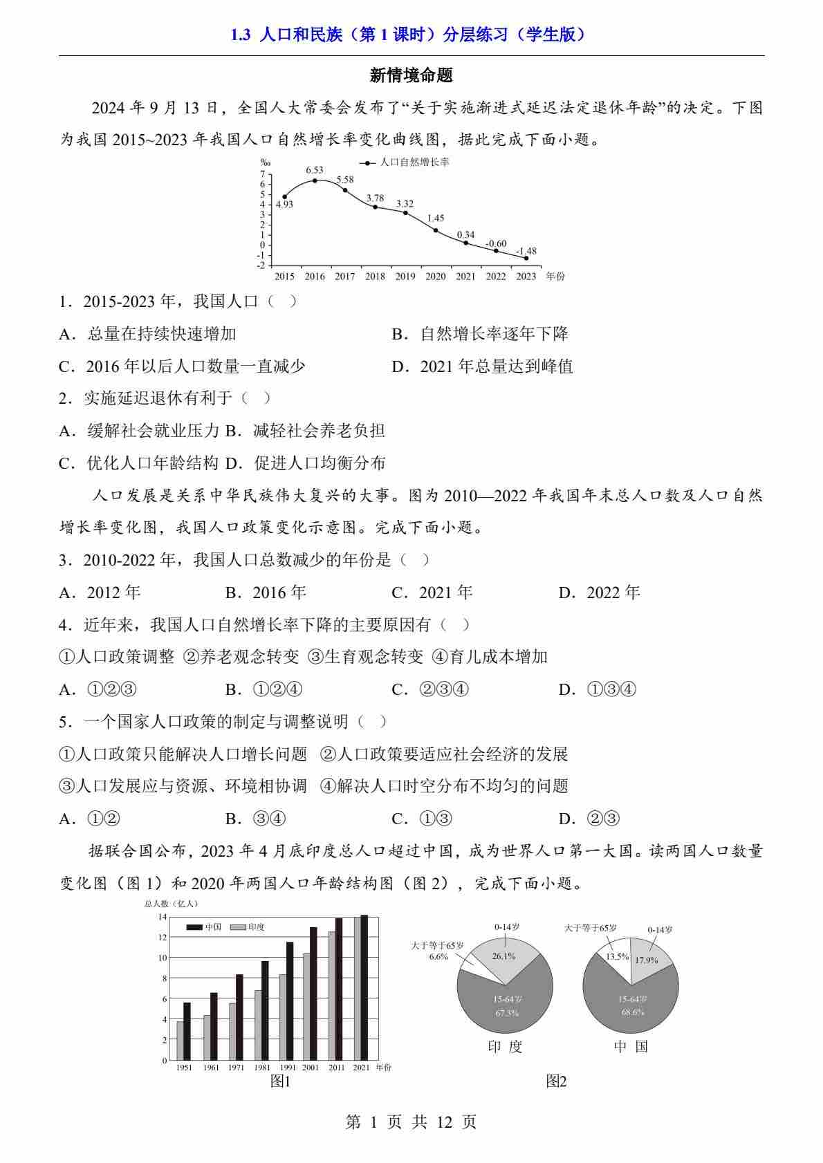 1.3 人口和民族 第1课时(分层练习)