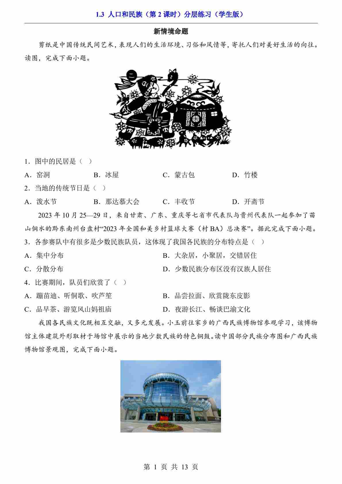 1.3 人口和民族 第2课时(分层练习)