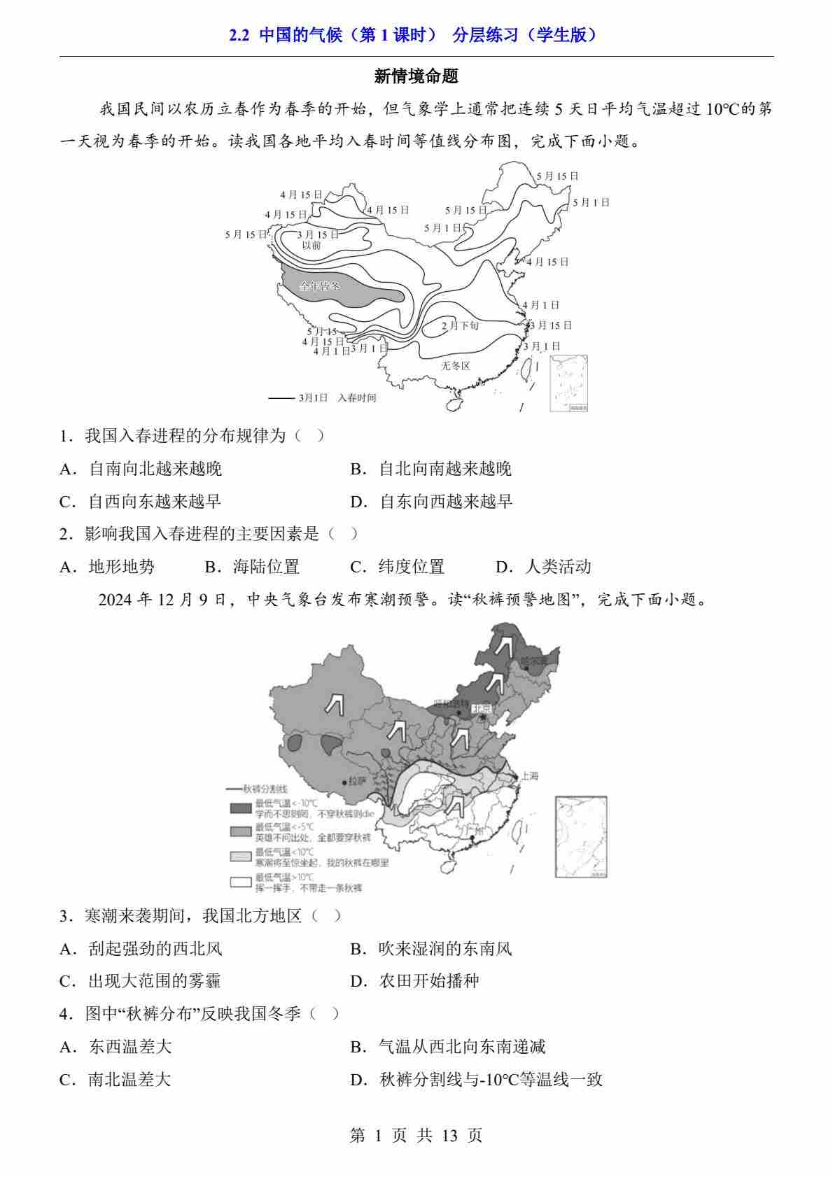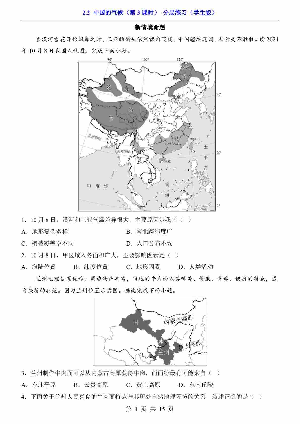 2.2 中国的气候 第1课时(分层练习)