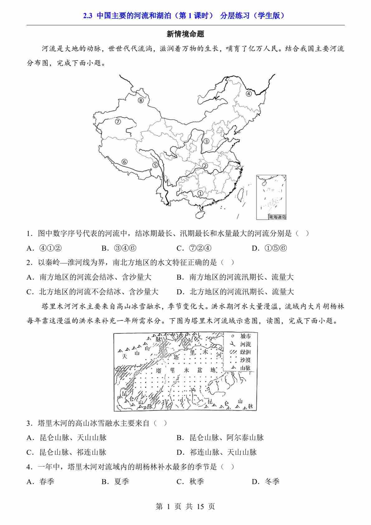 2.3 中国主要的河流和湖泊 第1课时(分层练习)