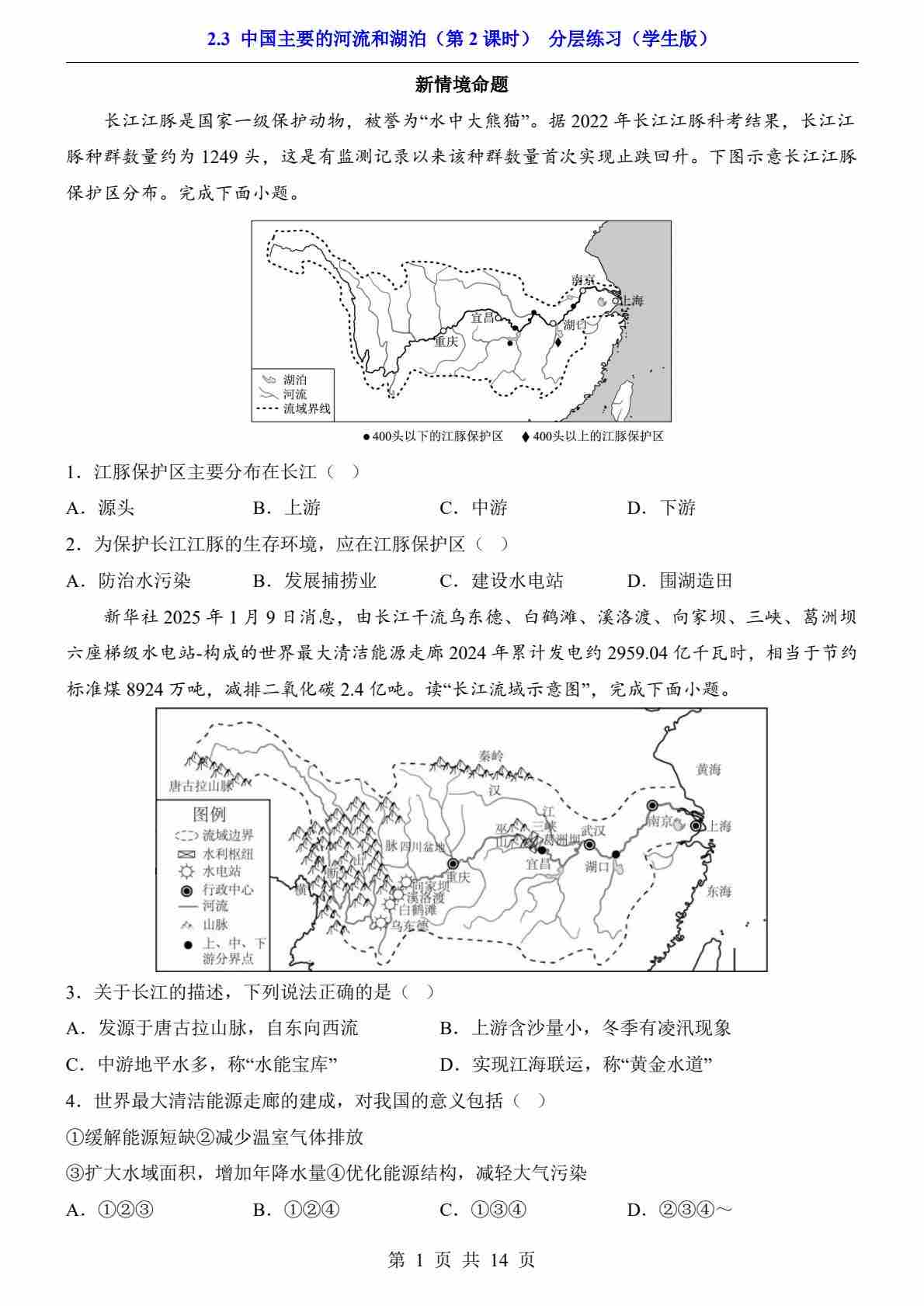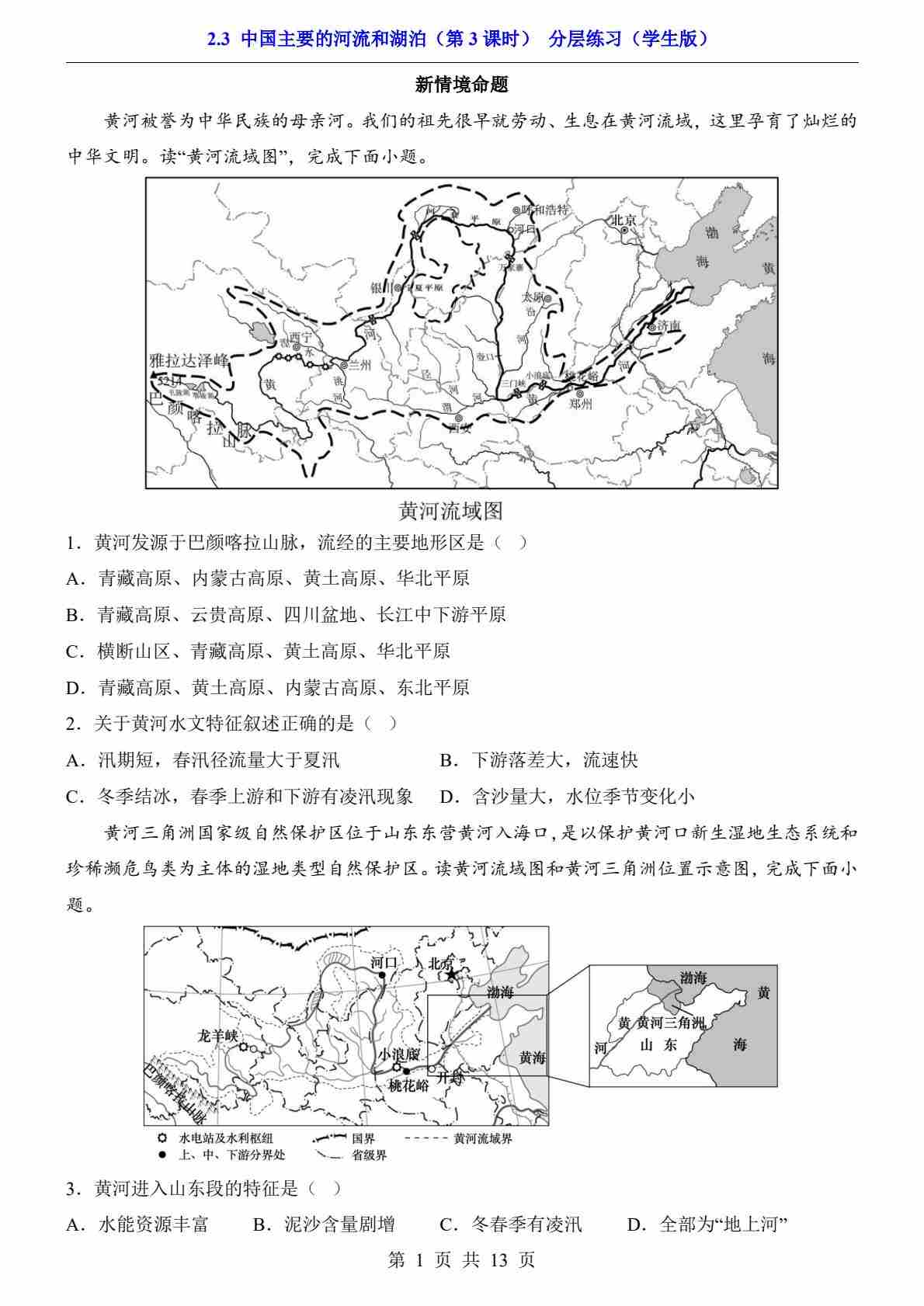 2.3 中国主要的河流和湖泊 第2课时(分层练习)