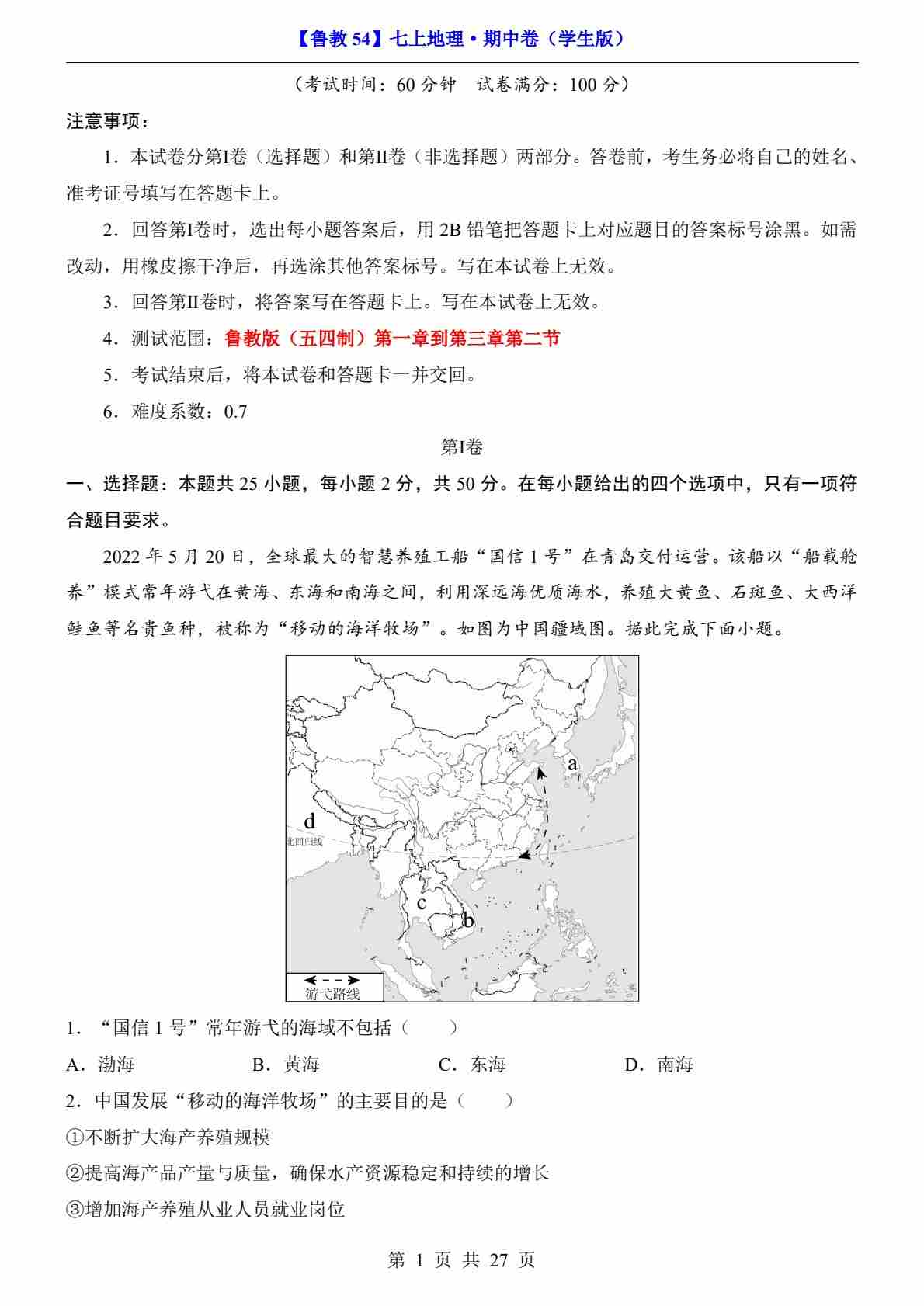 【鲁教54】7上地理期中卷【第1.1-3.2章】