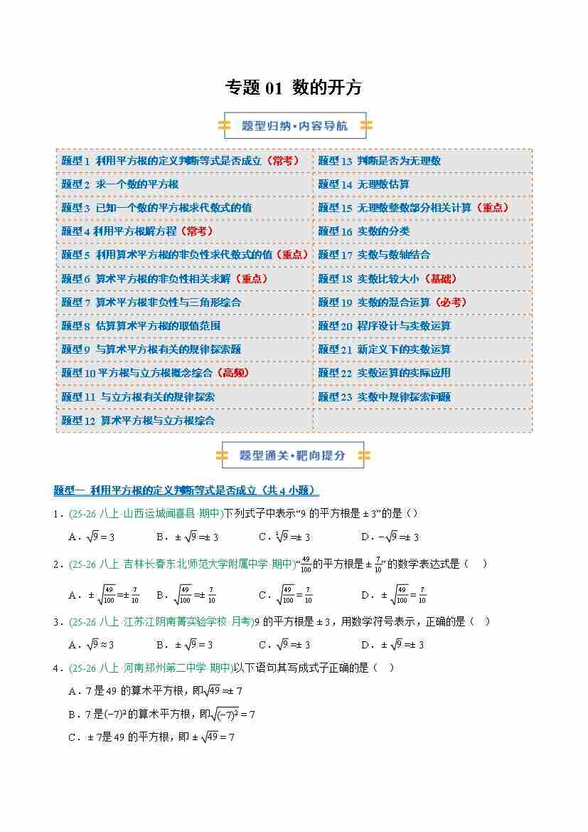专题01 数的开方(期末专项训练23题型)(学生版)